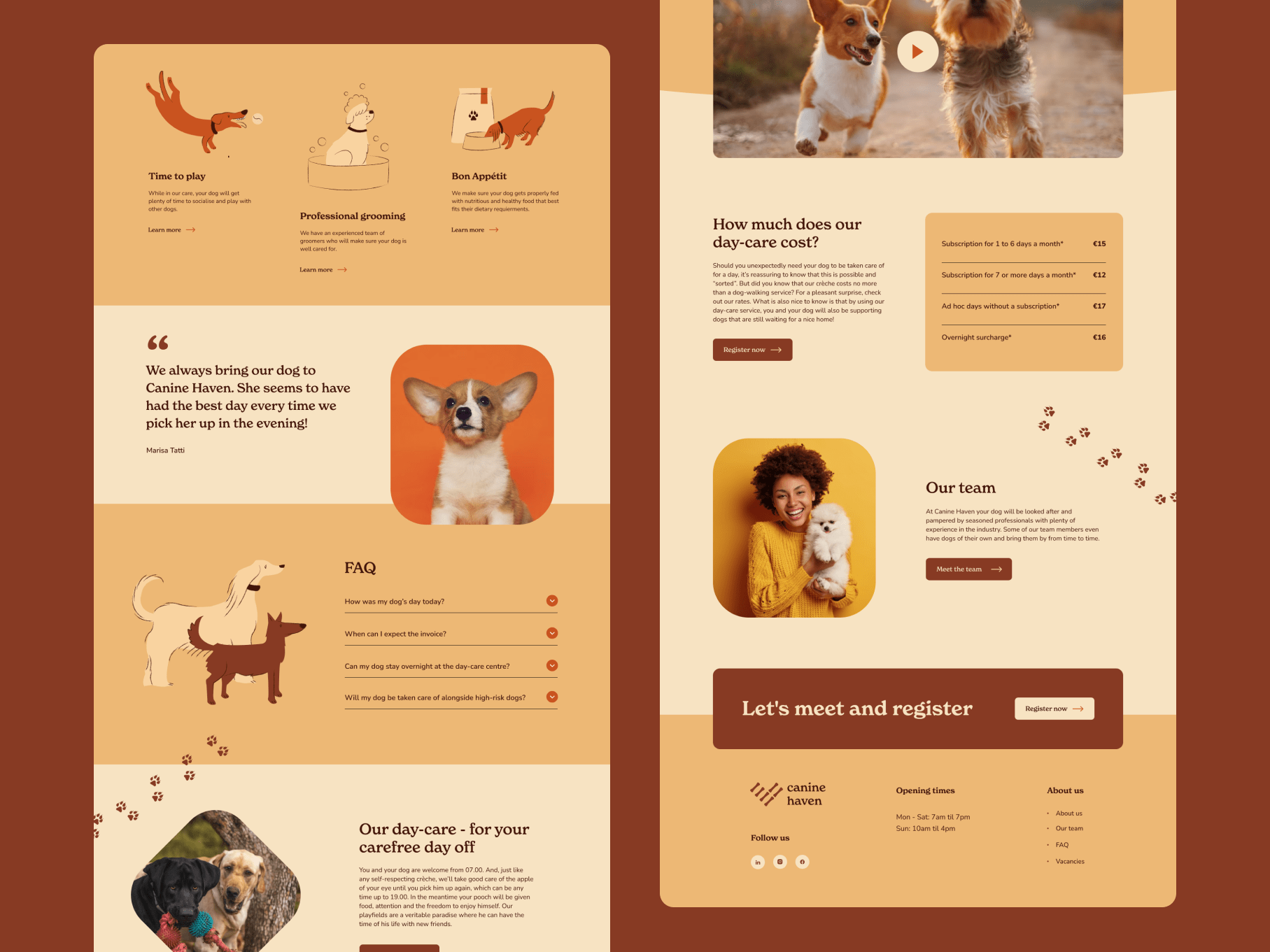 Canine Haven is een hondencrèche in New Jersey. De crèche neemt honden van alle rassen op en zorgt ervoor dat ze voldoende dagelijkse activiteit en socialisatie krijgen. Canine Haven biedt ook een professionele trimsalon. Het doel van het project was om een logo, een visuele identiteit, op maat gemaakte illustraties en een webdesign te creëren met een vriendelijke en betrouwbare uitstraling.