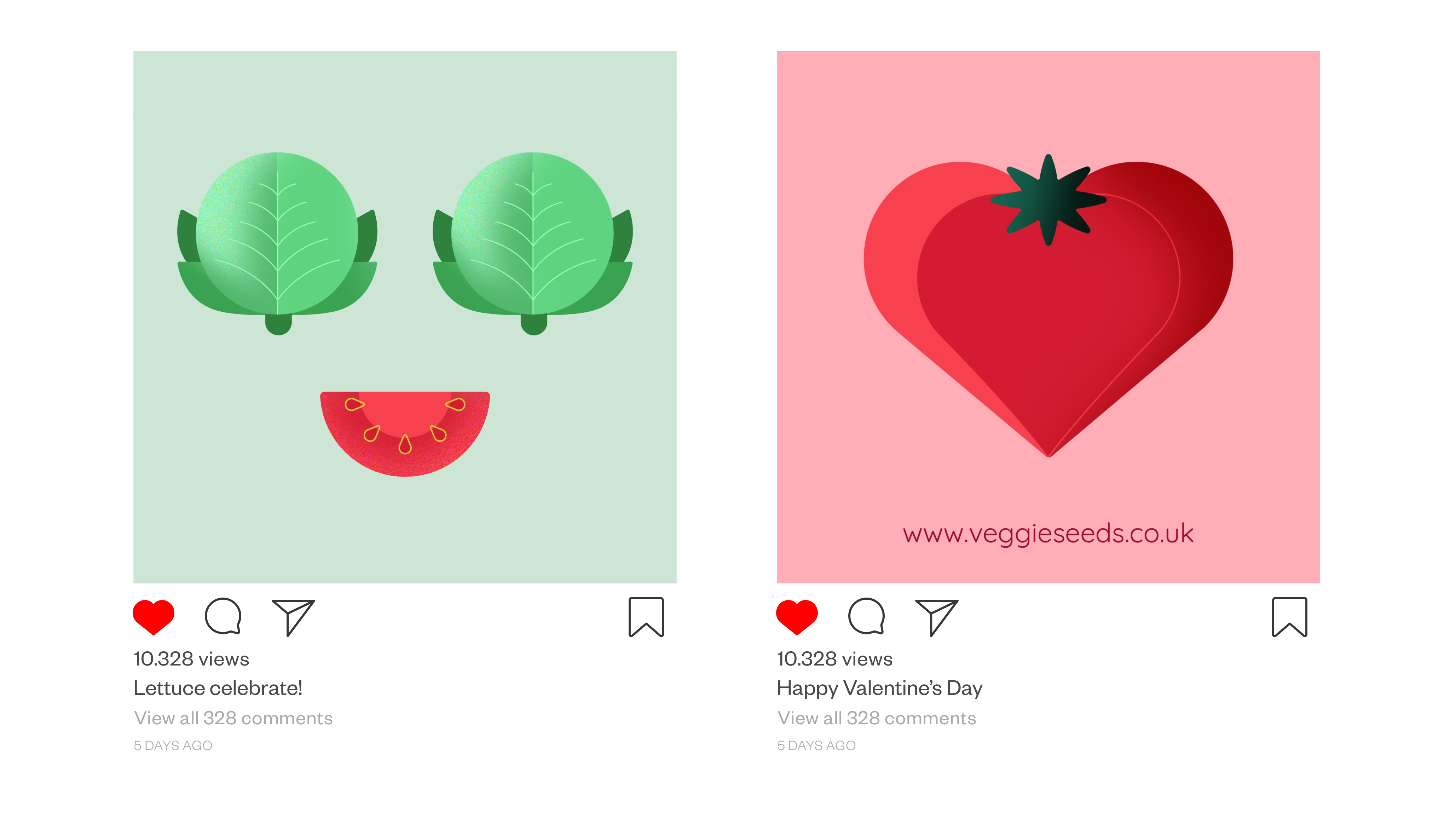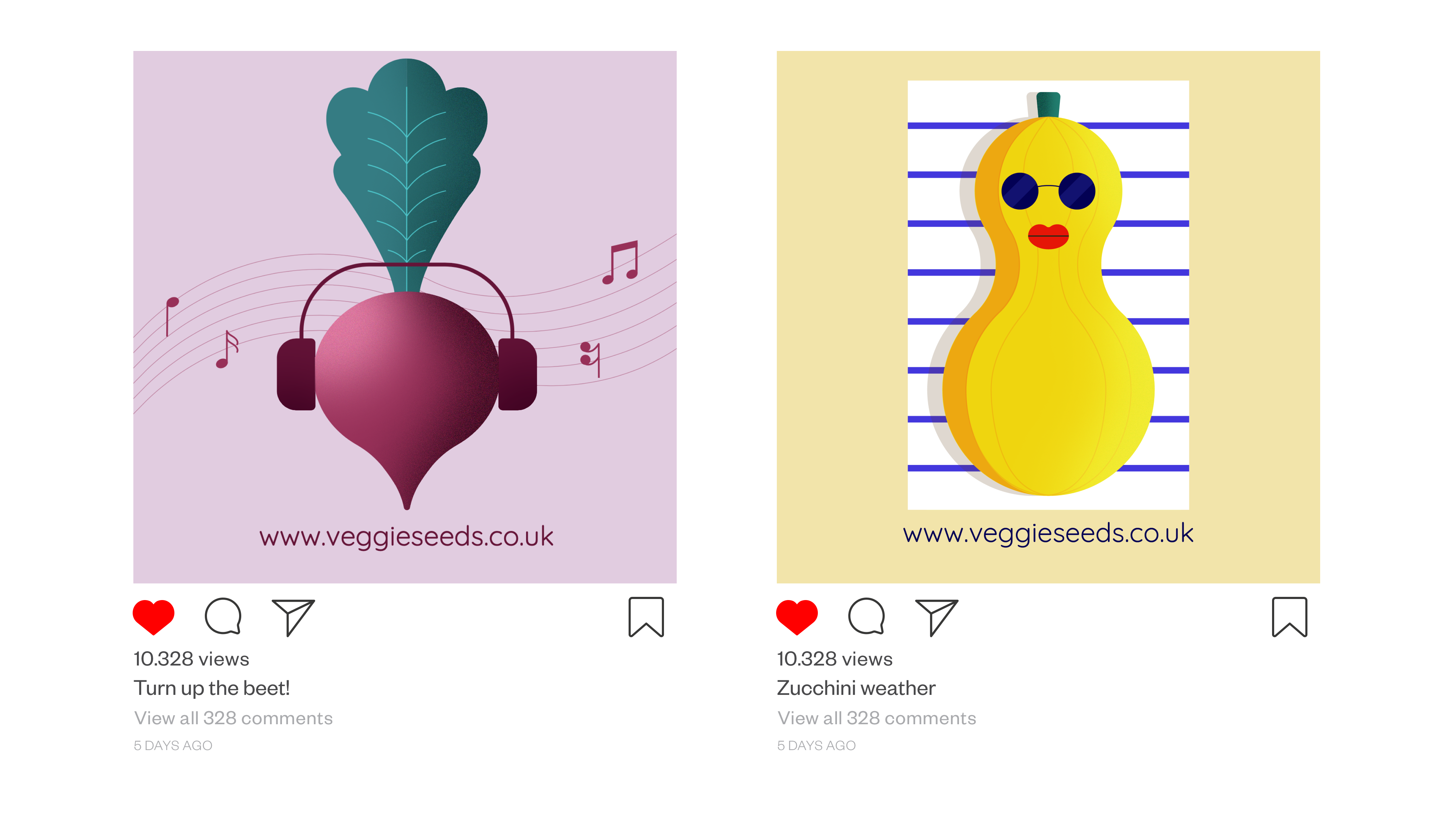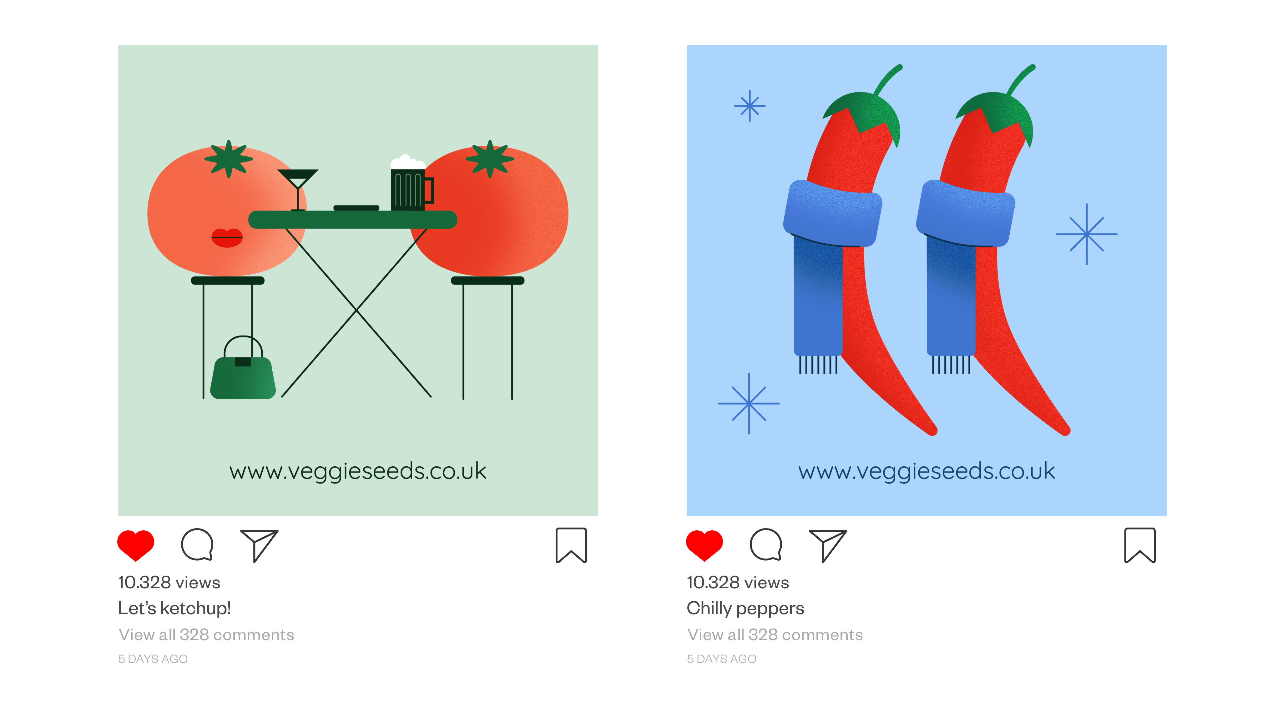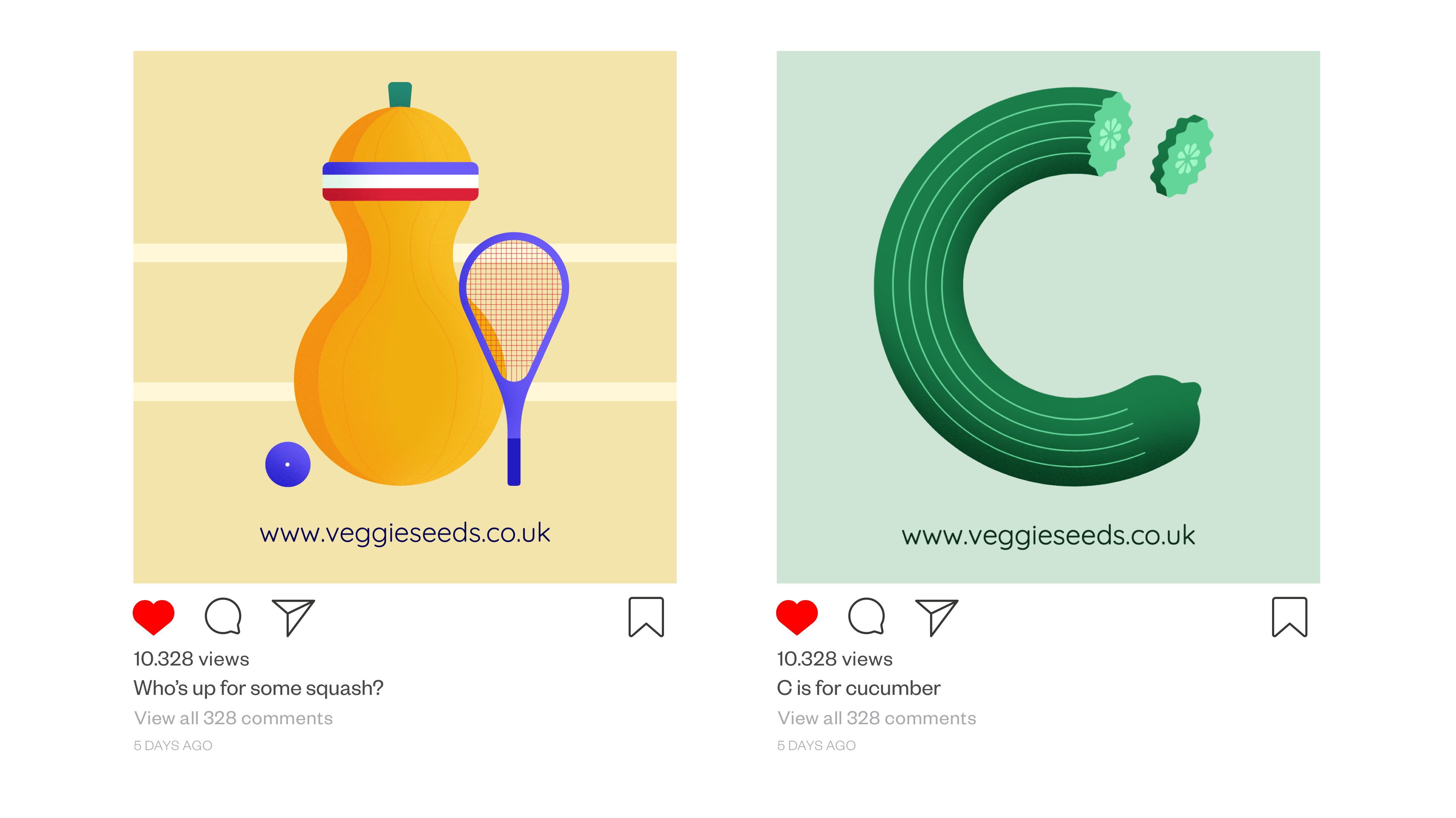 Veggie Seeds is een in het VK gevestigd bedrijf dat zaden van verschillende groenten verkoopt. Het doel van het project was om speelse illustraties te ontwerpen voor gebruik op sociale media, om een jonger publiek aan te spreken. De visuals zijn ontworpen op basis van woordspelingen in het Engels, bijvoorbeeld: “Let’s ketchup”, “Who’s up for squash” en “Turn up the beet”.